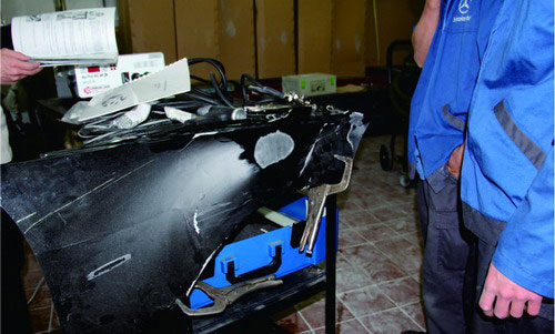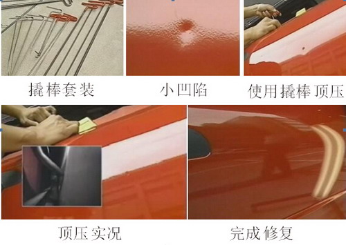 對于鋁板上的小凹陷,可以使用日照燈尋找凹陷點(diǎn),再用撬棒頂壓法,從板件內(nèi)側(cè)慢慢往外頂,但要注意不能過度頂壓,如圖1-91所示為撬棒頂壓法實例圖。