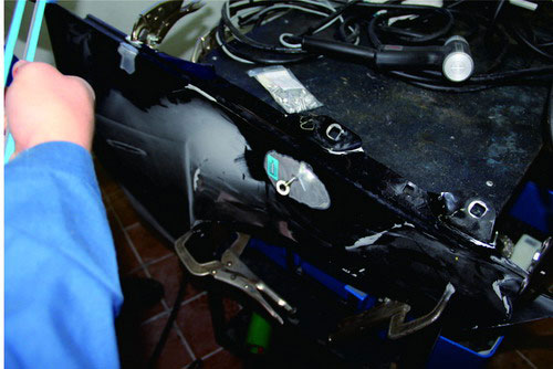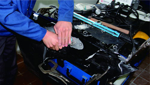 在鋁質(zhì)面板修復(fù)時,也可使用鋁整形機(jī)對損傷部位進(jìn)行拉伸修復(fù),在經(jīng)整形機(jī)修復(fù)到位后,使用專用工具將螺紋介子齊根剪下,再打磨平整即可。對于鋼板車身來說,當(dāng)面板和內(nèi)層結(jié)構(gòu)同時發(fā)生變形時,可以采取內(nèi)外層分離、分別修整,然后折邊咬合的修復(fù)方法。對于鋁質(zhì)面板,不能使用這種方法,否則由于鋁的韌度較差,折邊部位會出現(xiàn)裂紋或斷裂。