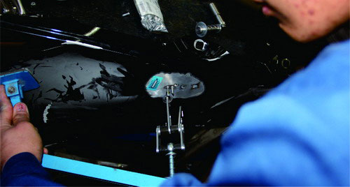 (8)相對于鋼板修復(fù),鋁質(zhì)車身板件更換的定位工作顯得更為重要。鋁質(zhì)車身粘接部位的粘接膠需要較長的固化時間,為防止粘接膠在固化后車身尺寸產(chǎn)生位移或變動,測量后必須使用定位夾或通用夾具對更換部件進(jìn)行定位。