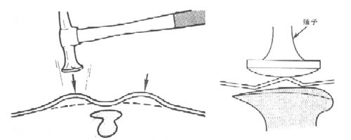 (1)為了降低拱起部位的高度,如果采用正托敲擊法,操作時應(yīng)多次輕敲,不能重敲,否則錘擊太重或次數(shù)過多會使鋁板延展拉伸,如圖1-89所示是正托敲擊法示意圖。