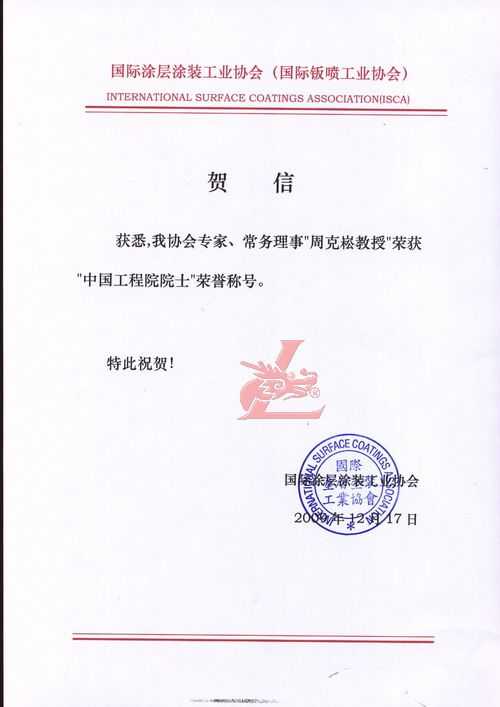 賀國際涂層涂裝工業(yè)協(xié)會專家常務理事克崧教授榮獲“中國工程院院士”[龍神秘書單位處] 賀國際涂層涂裝工業(yè)協(xié)會專家常務理事克崧教授榮獲“中國工程院院士”[龍神秘書單位處] 珠海龍神有限公司秘書處賀 2009-12-19 9013