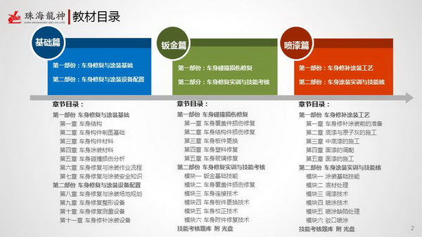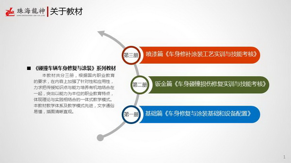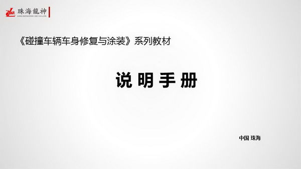 珠海市龍神有限公司2014年隆重巨獻(xiàn)《碰撞車(chē)輛車(chē)身修復(fù)與涂裝》系列教材:基礎(chǔ)篇《車(chē)身修復(fù)與涂裝基礎(chǔ)和設(shè)備配置》、鈑金篇《車(chē)身碰撞損傷修復(fù)實(shí)訓(xùn)與技能考核》、噴漆篇《車(chē)身修補(bǔ)涂裝工藝實(shí)訓(xùn)與技能考核》。