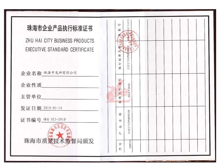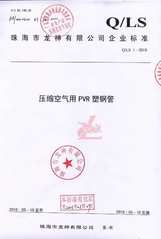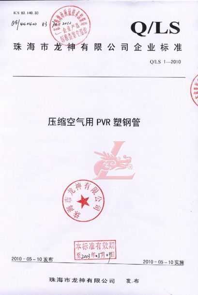 龍神壓縮空氣PVR塑鋼管成功申請企業(yè)執(zhí)行標(biāo)準(zhǔn) 2010年5月珠海市龍神有限公司“壓縮空氣PVR塑鋼管”得到珠海市質(zhì)量技術(shù)監(jiān)督局認(rèn)可,特此頒發(fā)“壓縮空氣PVR塑鋼管企業(yè)執(zhí)行標(biāo)準(zhǔn)”,龍神公司在嚴(yán)格執(zhí)行標(biāo)準(zhǔn)下,保證產(chǎn)品質(zhì)量。 2010-05-20 9881
