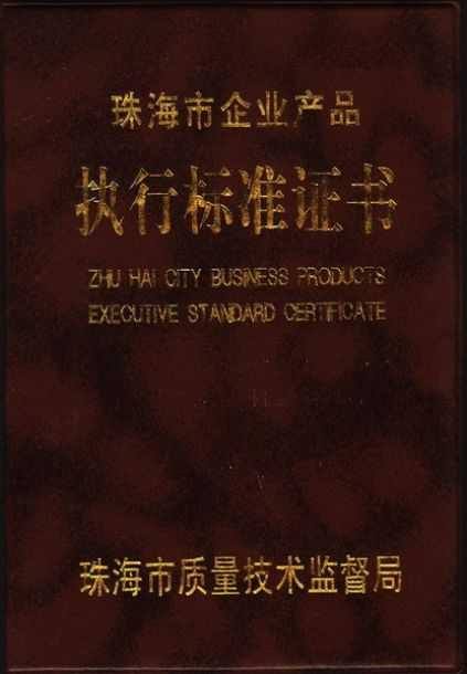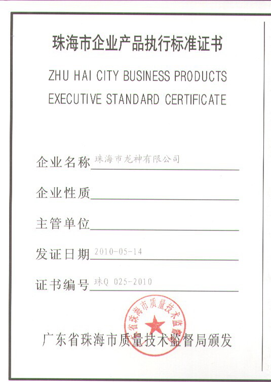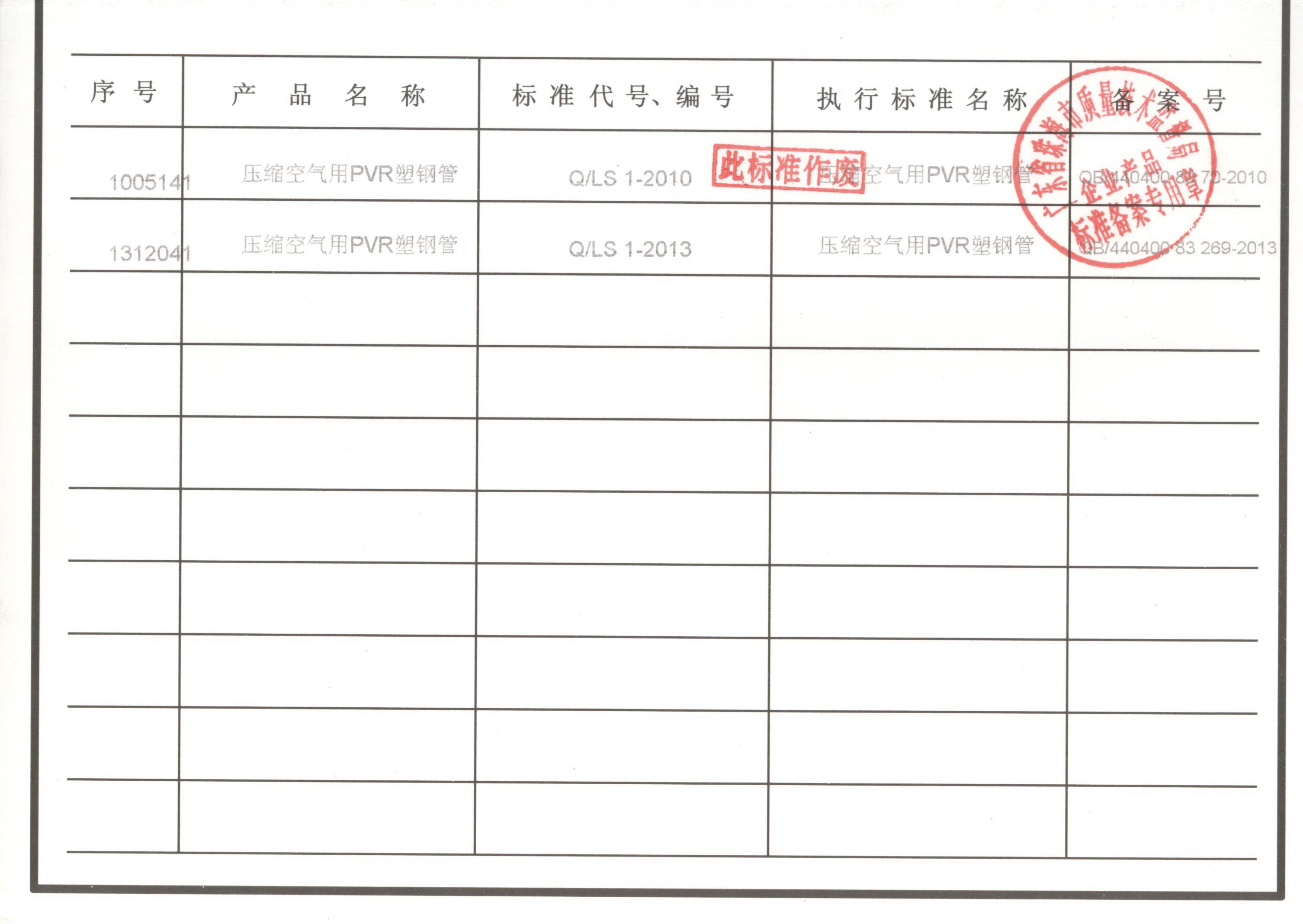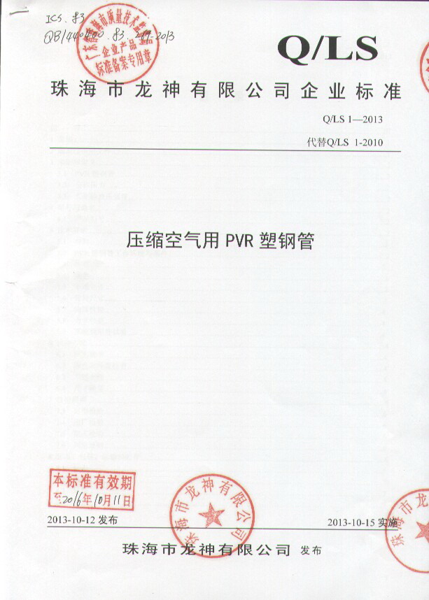 企業(yè)執(zhí)行標(biāo)準(zhǔn) 珠海市企業(yè)產(chǎn)品執(zhí)行標(biāo)準(zhǔn)證書 珠海市龍神有限公司企業(yè)執(zhí)行標(biāo)準(zhǔn) 壓縮空氣用PVR塑鋼管 2012-11-27 35043