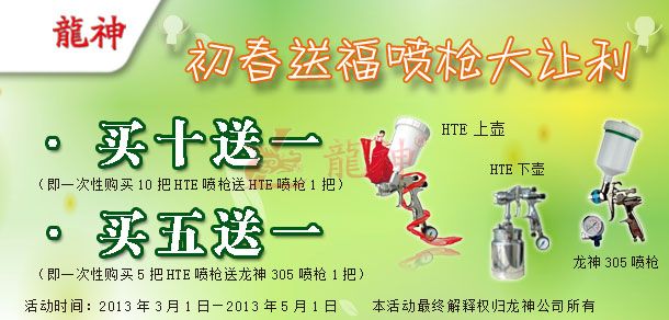 吉尼斯HTE噴槍“初春送?!贝黉N活動方案 2013-03-01 27892 吉尼斯HTE噴槍“初春送福”促銷活動方案 (產(chǎn)品編號:30282000-30286000) 2013年3月份市場促銷方案如下:一、主題:“初春送福”噴槍大讓利。二、活動時間:1、 時間:2013年03月1日至2013年05月1日 2、 時長:共計2個月 三、活動內(nèi)容:1、 買十送一(即一次購買十把HTE噴槍送一把HTE噴槍)2、 買五送一(即一次購買五把HTE噴槍送一把龍神305噴槍)四、具體操作方案 1、購買十把HTE噴槍送一把HTE噴槍 2、買五把HTE噴槍送一把龍神305噴槍 (以上二個方案具體促銷方式可按增量的形成搭配)