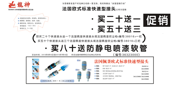 法國佩釜快速接頭“冰夏”讓利大促銷 2013-05-13 18632 法國佩釜快速接頭促銷方案(產(chǎn)品編號:36102000-36119000)一、主題:“冰夏”促銷行動 二、目的:回饋新老客戶,讓利大反饋 三、時間:1、 啟動時間:2013年5月13日 2、 結(jié)束時間:2013年7月13日3、 時長:2個月 四、活動內(nèi)容:1、 買二十送一(即買二十個快速接頭送一個法國佩釜快速接頭或法法國佩釜吹塵槍(編號:38016)一把) 2、 買五十送三 3、 買八十送防靜電噴漆軟管(編號:36323)五、其它 1、本活動最終解釋權(quán)歸珠海龍神所有。